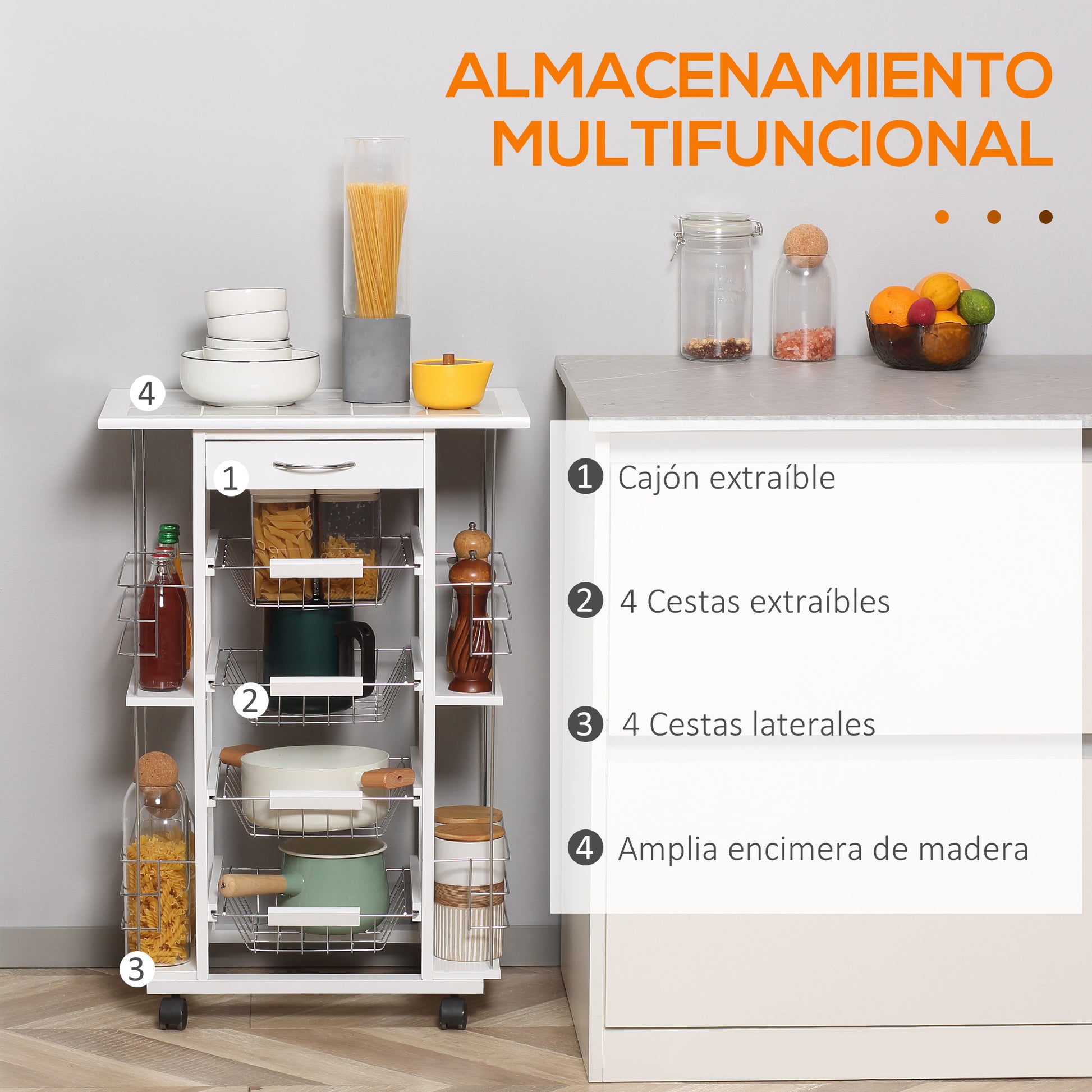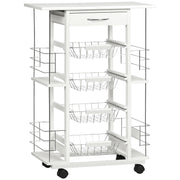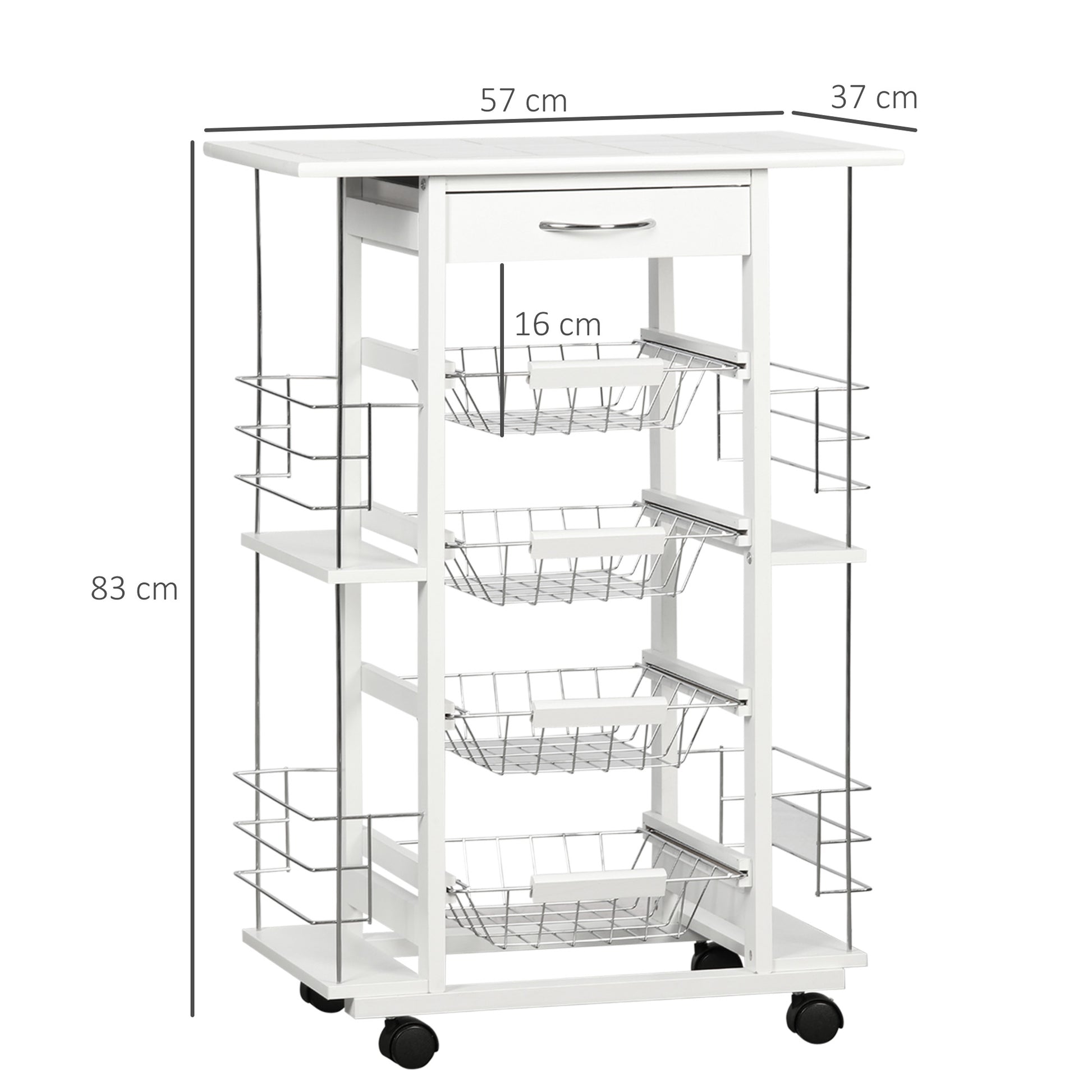 HOMCOM Kökvagn med Hjul Grönsaksvagn med Platt Keramisk Arbetsyta Låda 4 Metallkorgar och 4 Sidofack för Matrum 57x37x83 cm Vit