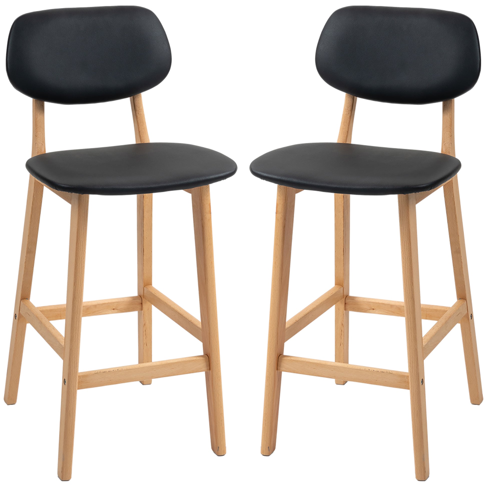 HOMCOM Set med 2 barstolar, moderna barstolar i syntetläder med ryggstöd och ben av trä, svart