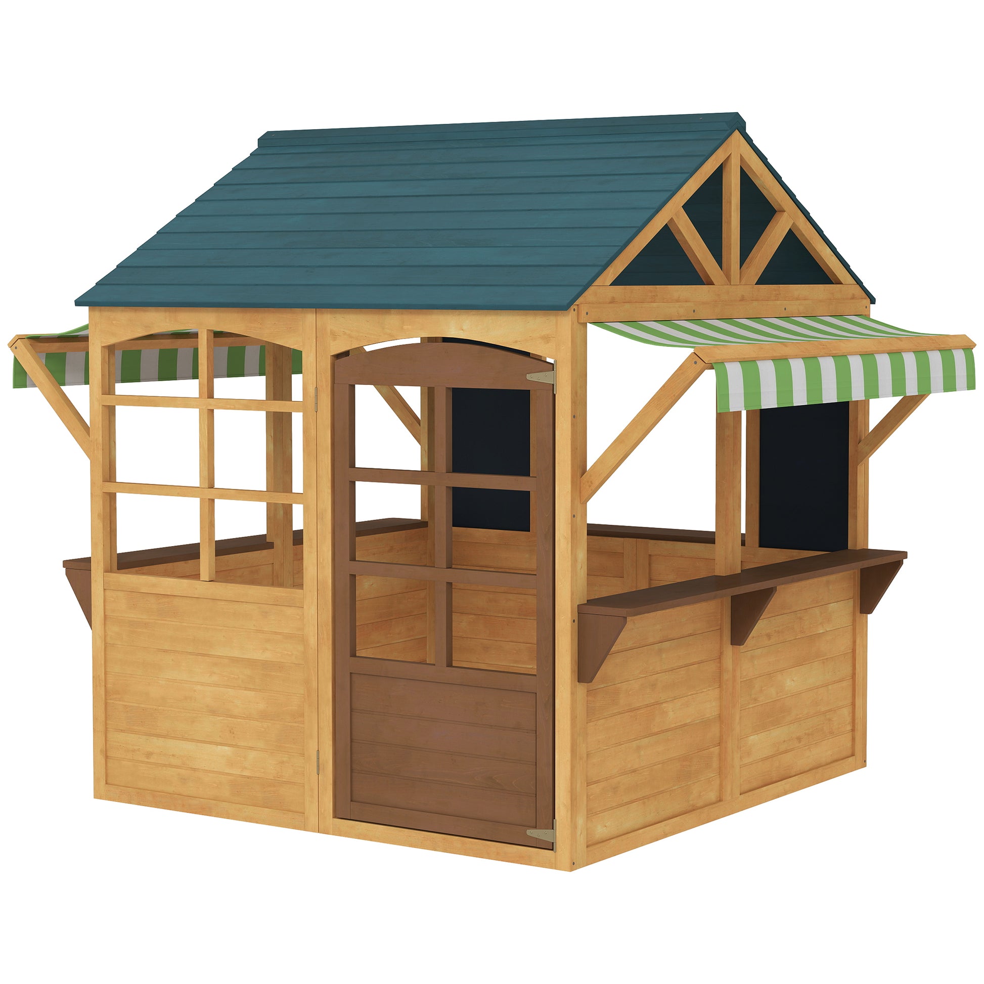 AIYAPLAY Fällbar Lekstuga i Naturligt Trä för Utomhusbruk med 2 Svarta Tavlor, Fönster och Markis - Barnens Trädgårdshus för 3 år och uppåt