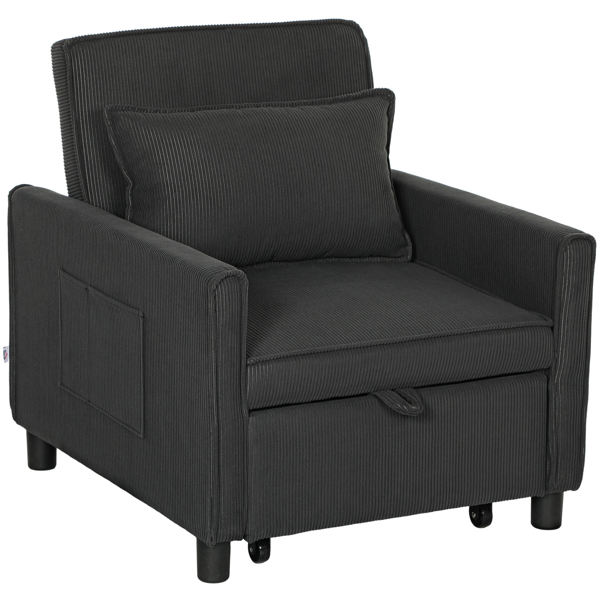 HOMCOM 3-i-1 Soffa-säng med sidofickor och justerbart ryggstöd, modern konvertibel soffa till liggsoffa eller säng i sammetliknande tyg, 74x84x81 cm, Mörkgrå