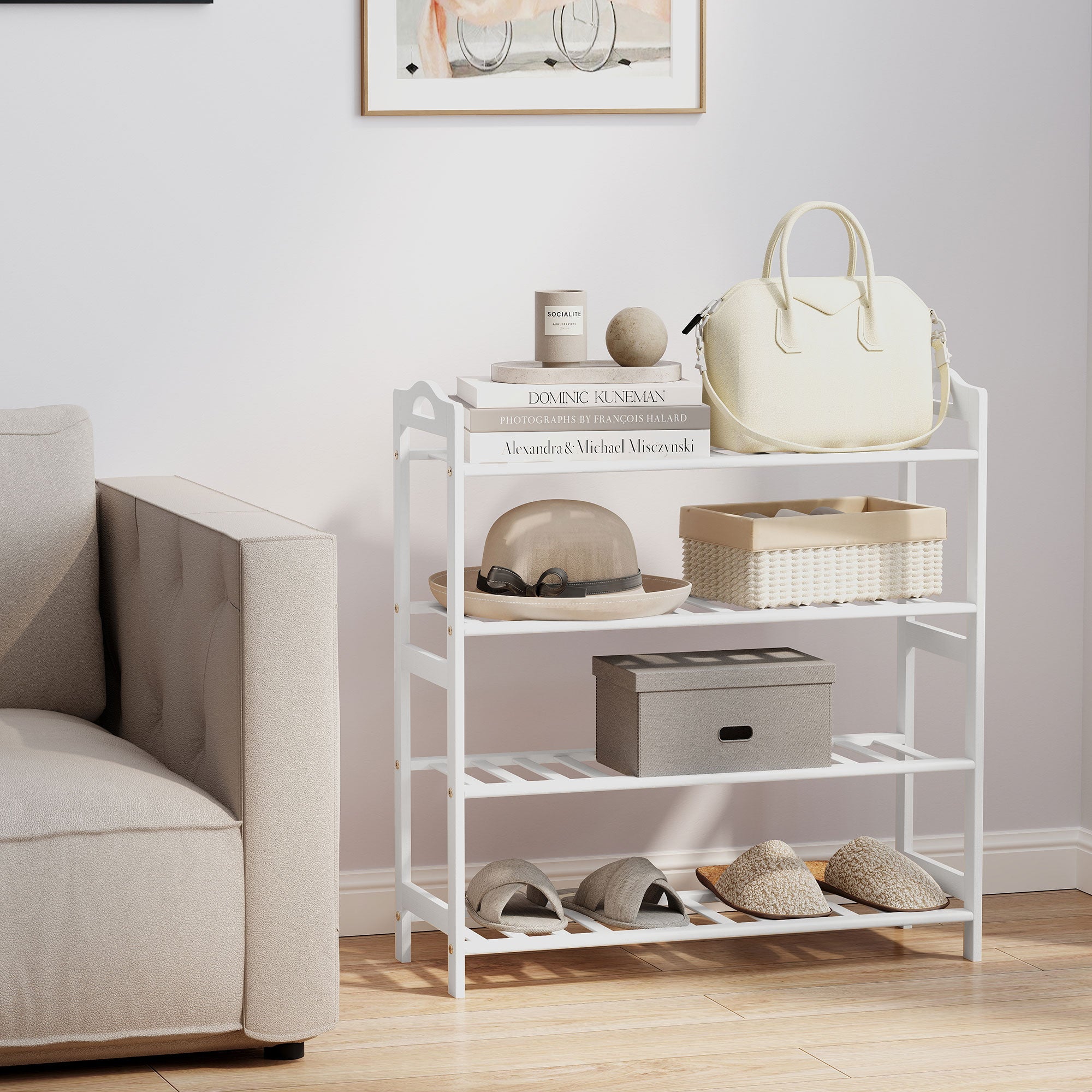 - - 4-NIVÅ DESIGN: Detta vertikala skoställ med fyra öppna hyllor med spaljéer gör det möjligt att placera upp till 12 par skor. Dess öppna struktur främjar ventilation och enkel åtkomst, idealiskt för entrén, hallen eller sovrummet.
