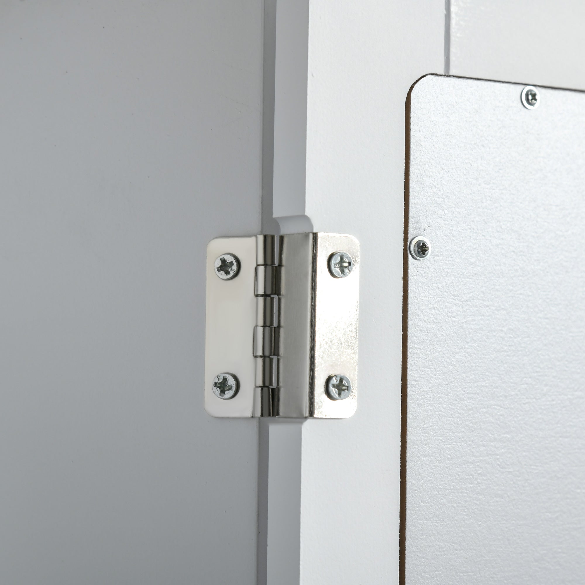 - - FÖRSIKTIG DESIGN: Den laminaterade ytan på detta badrumsskåp med spegel skyddar den mot fukt, vilket gör den perfekt för användning i badrummet. De vita finisharna, dörrar med magnetstängning och silvermetallhandtag ger rymlig förvaring och en elegant look.