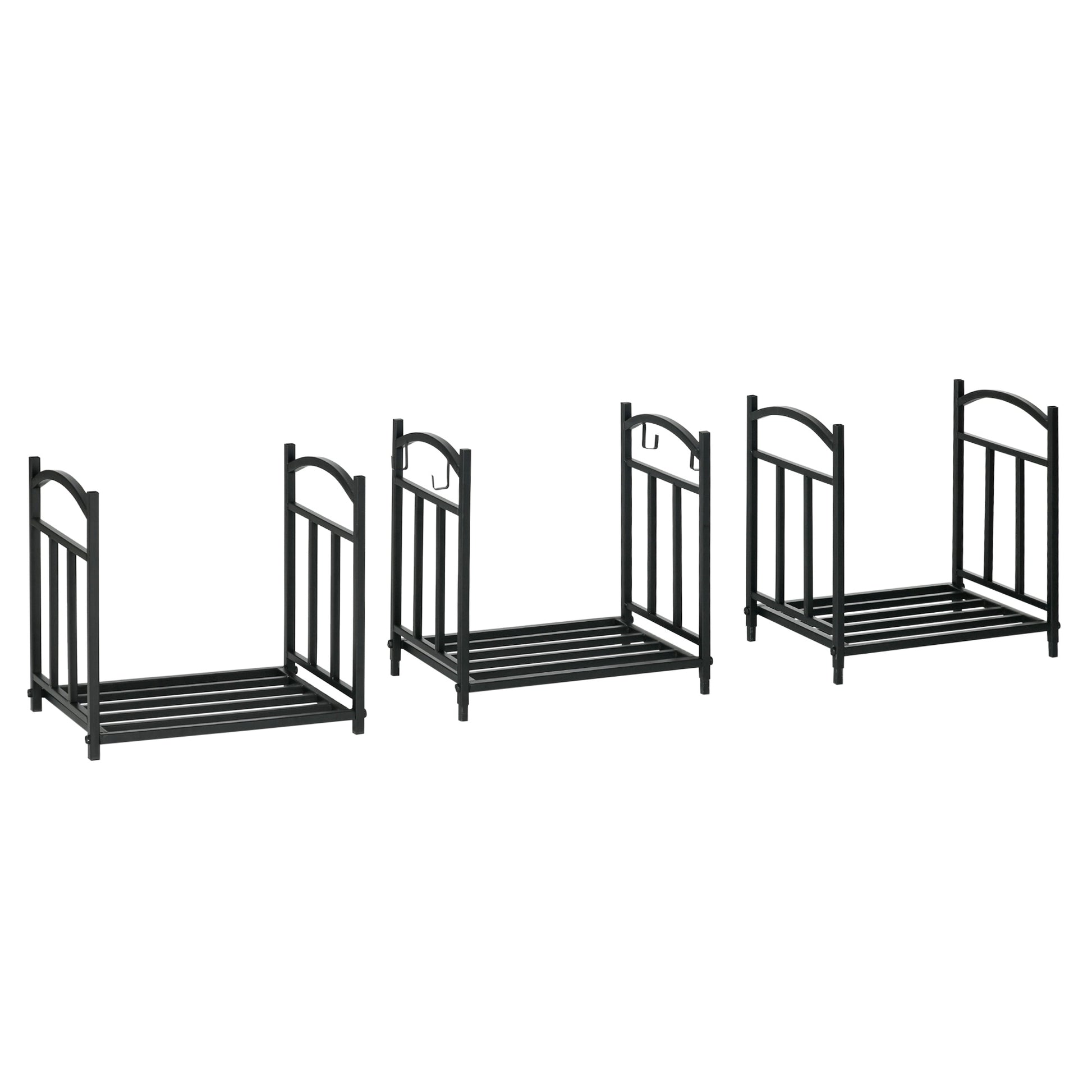 Outsunny Eldved Rack för Inomhus- och Utomhusbruk 3 Nivåer, Separat eller Staplad, Metall Eldved Rack med Verktygshakar, Svart