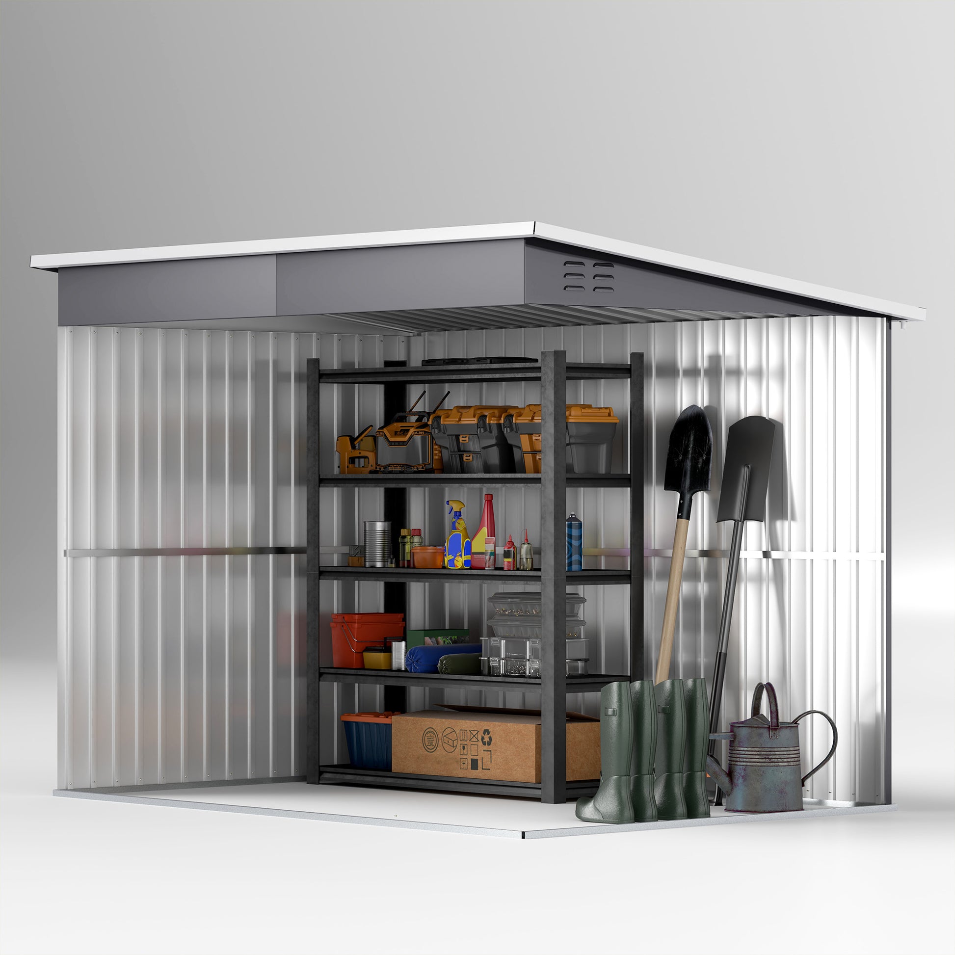 - - Väderbeständigt: Tillverkat av galvaniserat stål, klarar detta utomhusförvaringsskjul väderförhållanden utan att flagna, spricka eller deformeras, vilket garanterar en lång livslängd och skydd.