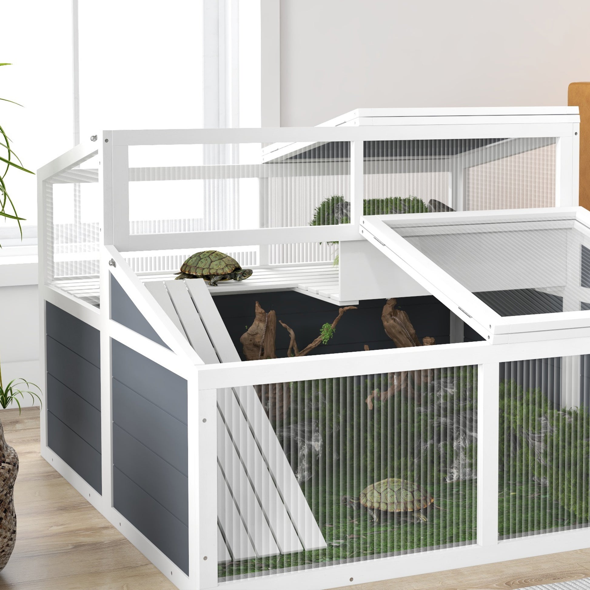 PawHut Sköldpaddshus Inhägnad Bur för Smådjur med 2 Utrymmen Polykarbonat Tak, 3 Dörrar, Ramp, 115 x 115 x 82 cm - Grå